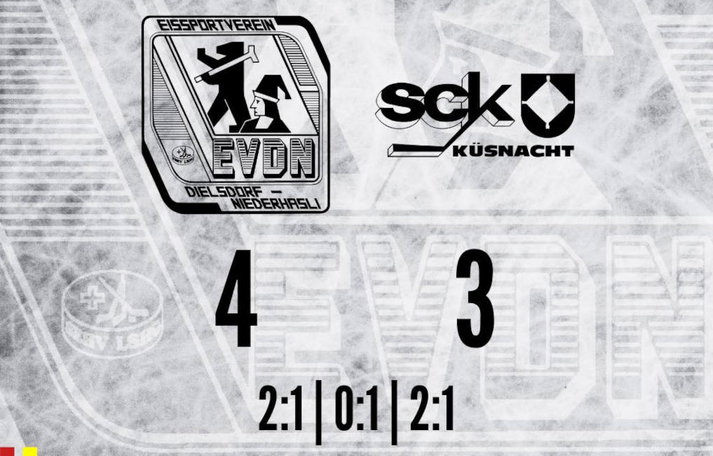 Zwischen dem EVDN und dem 2. Liga Schweizermeister 24/25, SC Küsnacht, blieb die Partie bis zur letzten Sekunde spannend. Zwar führte der EVDN bereits in der 5. Spielminute mit 2:0, liess den SCK dann aber durch zwei individuelle Fehler den Anschluss-, resp. Ausgleichstreffer erzielen (6. und 21. Spielminute). Das Spiel war äusserst ausgeglichen, dies zeigt sich auch bei einem Blick auf die Torschussstatistik (30 Schüsse EVDN, 34 Schüsse SC Küsnacht). Spielentscheidend war unter anderem eine doppelte Überzahlsituation anfangs des dritten Drtittels, welche die Hausherren zum 3:2 und zum 4:2 Führungstreffer ausnutzen und die Weichen somit auf Sieg stellen konnten. Zwar kam Küsnacht in der 55. Minute noch einmal zum 4:3 Anschlusstreffer, doch der Ausgleich gegen Spielende blieb ihnen, trotz viel Druck, verwehrt.